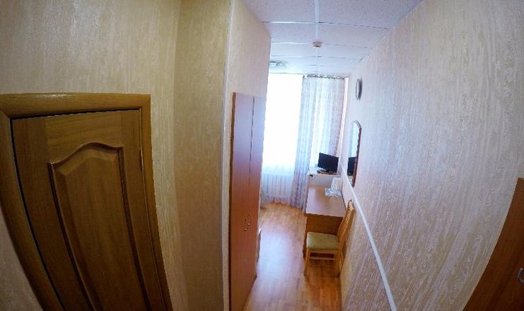 В номере: стол, 1 стул, встроенный шкаф-купе, телевизор, холодильник, электрочайник, фен, односпальная кровать.